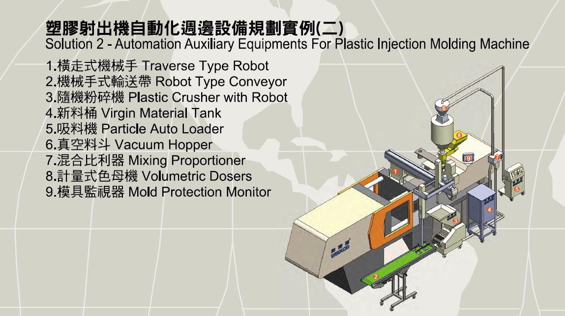 - After the sprue is taken out, it is thrown into (3) crusher by (1) traverse type robot for immediate crushing.