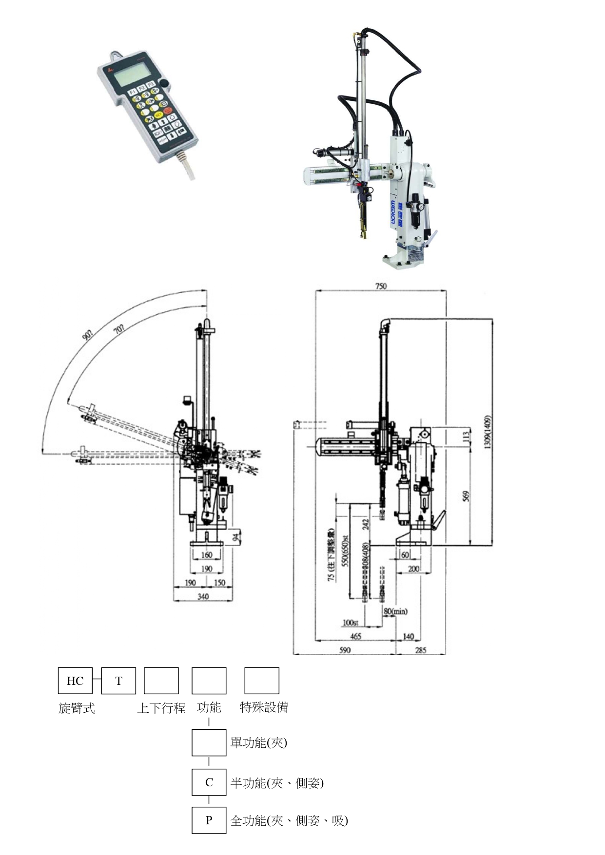 旋臂式机械手臂,可以达到塑胶射出成型厂自动化的要求。
