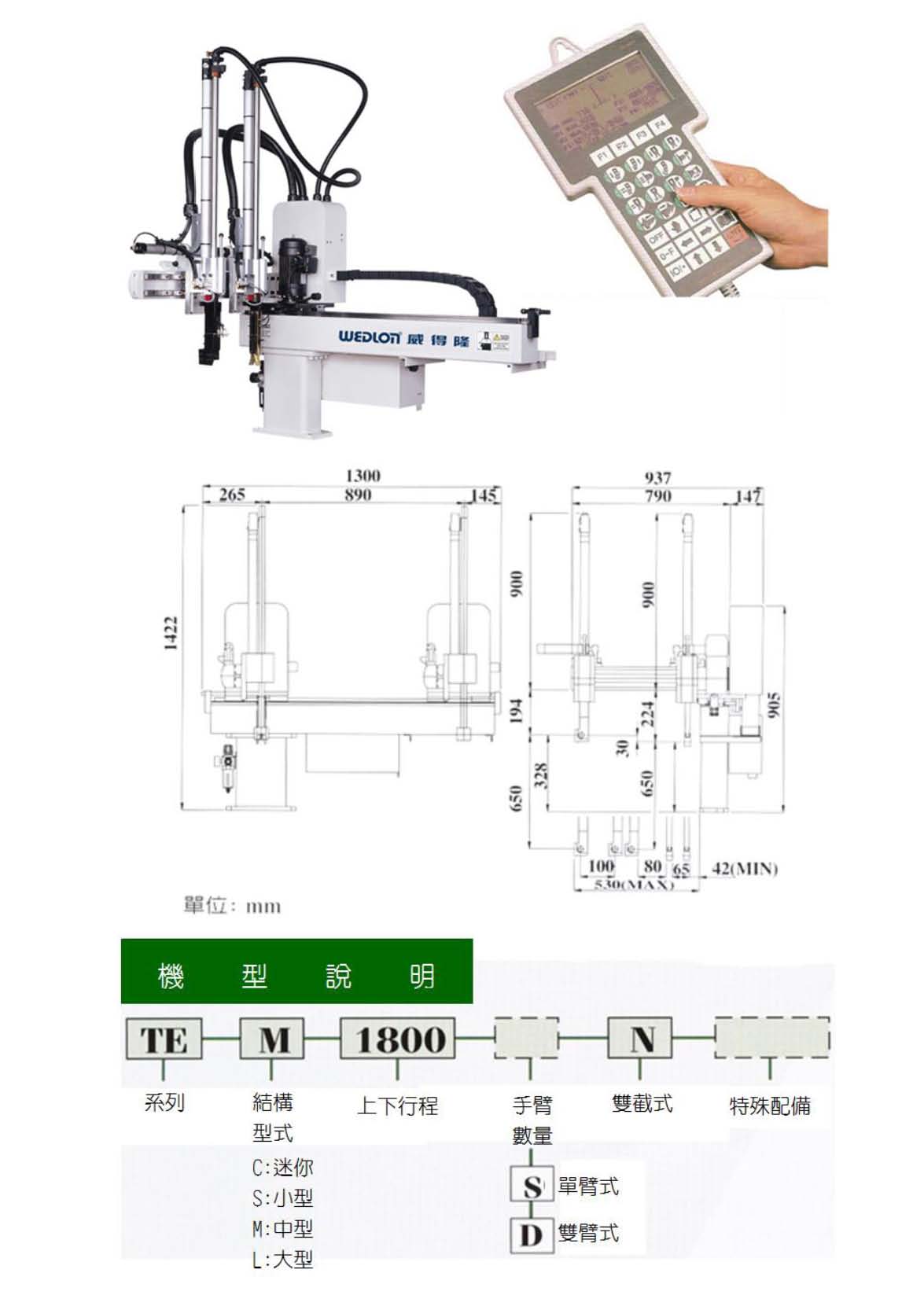 迷你橫走式機械手臂,被廣泛應用於50T ~ 150T塑膠射出成型機。